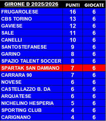 Dopo cinque giornate, lo Spartak resta a quota 4 punti, frutto della vittoria all’esordio contro lo Sporting Club, due sconfitte interne e il pareggio esterno contro il Nichelino. La squadra di