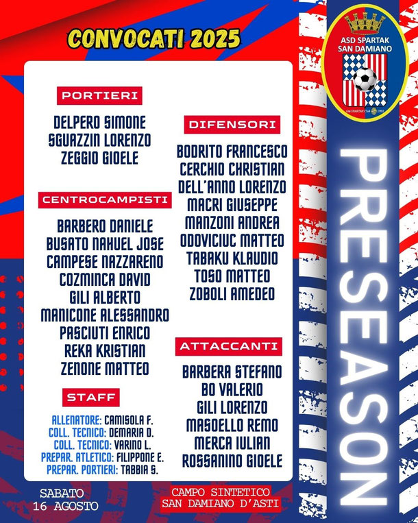 Formazione Spartak: Zeggio, Manzoni, Zoboli (72’ Manicone), Zenone (56’ Gili A.), Dell’Anno, Macrì, Merca (69’ Gili L.), Busato, Barbera, Pasciuti (80’ Rossanino), Campese (45’ Bo).