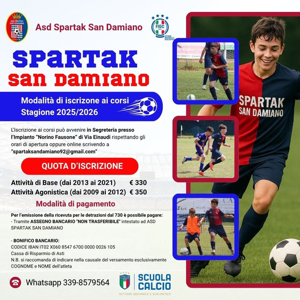 - Tramite ASSEGNO BANCARIO "NON TRASFERIBILE" intestato ad ASD SPARTAK SAN DAMIANO